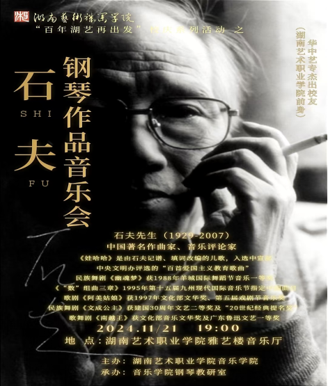 正值“百年湖艺再出发·校友回湘点亮校园”系列活动尾声之际,11 月 21 日,音乐学院在雅艺楼音乐厅举办了湖艺百年再出发系列活动,邀请了旅法青年钢琴演奏家、中国现当代钢琴音乐倡导者与演绎者陆倍文老师来到音乐学院为学生进行了一场诠释中国作品演奏之道的专题讲座以及石夫钢琴作品音乐会。
